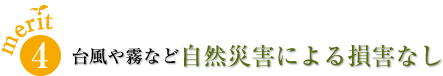 - 台風や霧など自然災害による被害を受けることがありません。これまで付きものだった悪天候・自然災害によるリスクを回避できる上、天候によって作業を左右されないので管理が簡単にできます。 また、大きな負担となる土づくりの必要もありません。